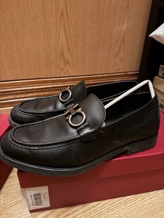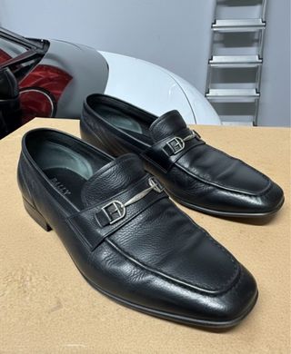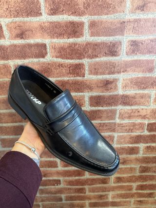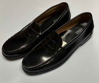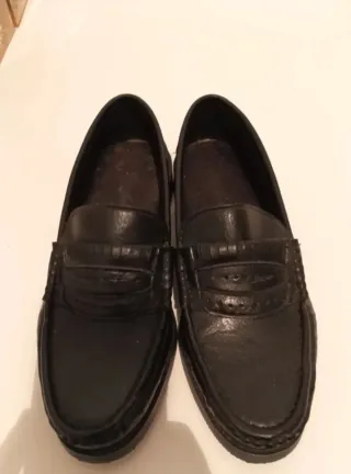 Nuevos y elegantes mocasines clásicos tipo color negro. Es un zapato atemporal, perfecto para quienes buscan un estilo impecable tanto en la oficina como en ocasiones especiales. • Material: Piel y semipiel con un acabado suave y un brillo natural muy cuidado. • Diseño: Estilo Penny Loafer con el detalle de la tira clásica sobre el empeine y puntera redondeada. • Interior: Forrados totalmente en tono natural, lo que garantiza comodidad y durabilidad. • Estado: sin estrenar En muy buen estado de conservación. Se aprecia el código de autenticidad y la talla grabados en el interior. • Talla: 43/44 (9 1/2 UK).