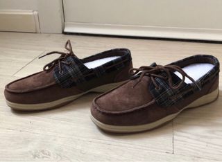 Mocasine de hombre de ante en color marrón, con detalles de cuadros, estilo casual. Son muy cómodos, ideales para el día a día o para ir arreglado sin perder confort. ✔️ En buen estado ✔️ Interior limpio ✔️ Suela en buen estado ✔️ Diseño clásico que combina con todo. Perfectos para uso diario, trabajo o paseos. Se venden por no usarlos. - Diseño tipo náutico. - Cordones marrones. - Suela de goma.