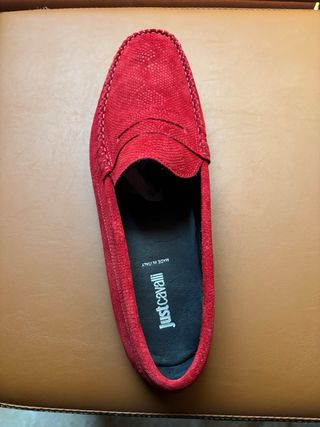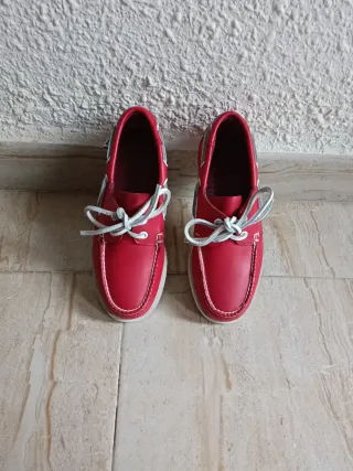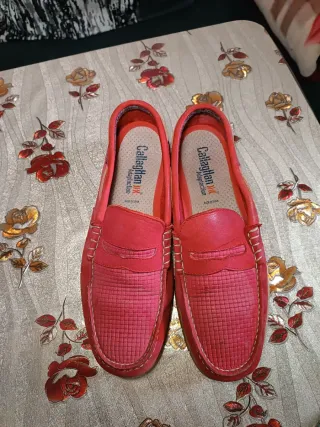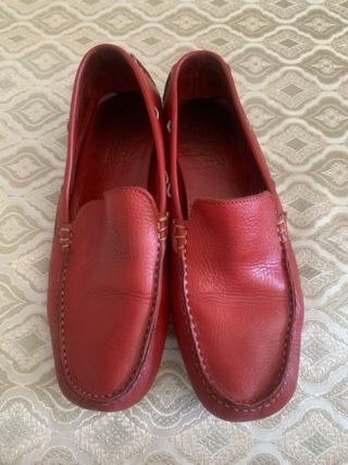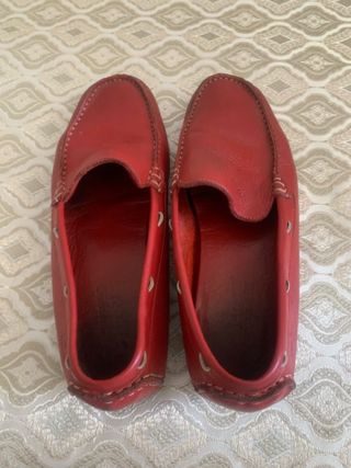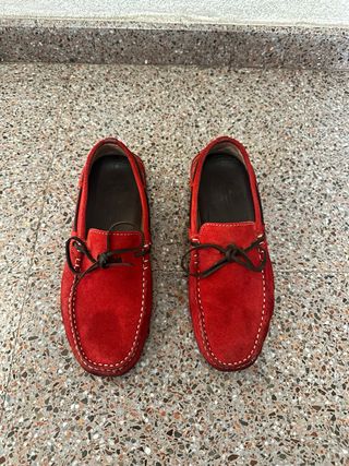 Mocasines de ante en un vibrante color rojo talla 41 no tienen caja buen estado - Diseño clásico de mocasín. - Detalle de cordones en la parte delantera. - Costuras visibles en contraste.