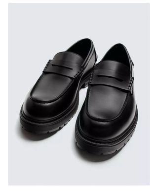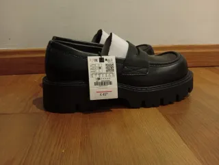 Mocasines de la marca Zara en color negro y talla 40. Un calzado elegante y moderno. - Diseño tipo mocasín. - Suela gruesa y robusta. - Detalle de antifaz en la pala.