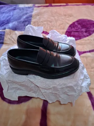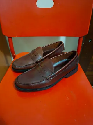 Mocasines estilo penny loafer en un elegante tono burdeos - Diseño clásico. - Acabado brillante. - Detalle de pespuntes. En perfecto estado como nuevo, puestos literalmente 2 veces. Color de moda, muy bonito. Vendo porque calzo 44 y este compré porque no había 44, ahora ya lo tengo.