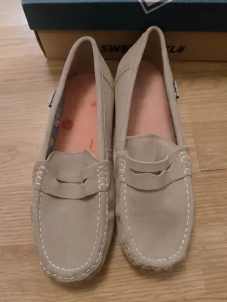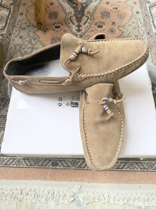 Mocasines de ante en color beige. Un calzado cómodo y versátil. -Muy cómodos - Diseño tipo mocasín. - Costuras decorativas. - Suela interior acolchada. -No ACEPTO BIZUM NI PAGOS POR WALLAPOP SOLO EFECTIVO ENTREGA EN PERSONA GRACIAS