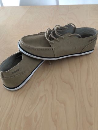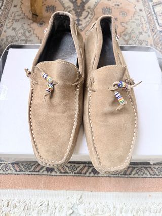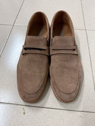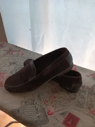 mocasines de la prestigiosa firma española Pedro del Hierro. Un calzado que destaca por su diseño híbrido, combinando la sobriedad del ante con detalles modernos que los hacen únicos. • Material: Ante (suede) de primera calidad en un tono arena muy elegante y fácil de combinar. • Diseño Exclusivo: Incorpora un refuerzo técnico en el talón con el logo de la marca, aportando un aire deportivo y actual. • Confort: Interior totalmente forrado en piel negra para asegurar la máxima comodidad y transpirabilidad. • Suela: Suela ergonómica de cuero diseñada para ofrecer flexibilidad y un excelente agarre. • usado pero bien conservado