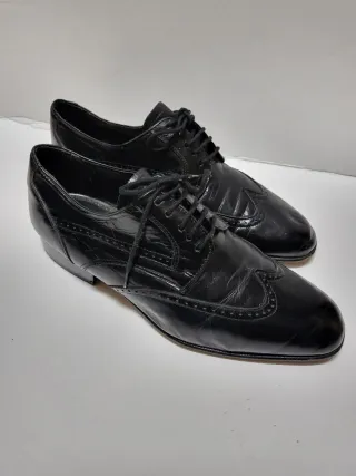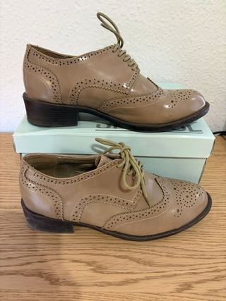 Mocasines de estilo Oxford con un acabado brillante y detalles perforados. - Diseño clásico con cordones. - Adornos festoneados en los bordes. - Tacón bajo y cómodo.