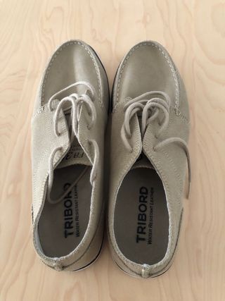 Zapatos náuticos de la marca Tribord (Decathlon) de ante beige. - Diseño casual y cómodo. - Cierre con cordones. - Detalle de costuras.