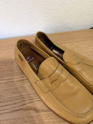 Mocasines de ante para caballero en color beige. Un calzado cómodo y versátil. - Material exterior de ante. - Diseño clásico de mocasín. - Detalle de pespuntes. Una pequeña mancha en un lateral (ver foto)