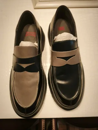 Mocasines de la marca Camper en color negro y gris. Un diseño elegante y cómodo. - Muy bien cuidados. Me costaron 165€. - Diseño de mocasín. - Tira decorativa en la parte superior. - Suela gruesa.