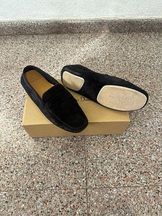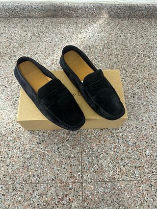 Elegantes mocasines de ante en color negro talla 43 muy poco uso blanditos y cómodos de llevar - Diseño clásico. - Detalle de antifaz. - Suela flexible.