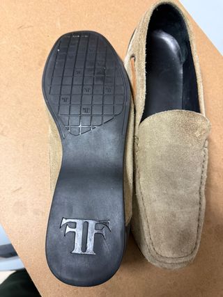 Artesanía española de máximo nivel. Vendo estos exclusivos mocasines de la firma Farrutx, un referente del calzado de lujo "Made in Spain". Se trata de un modelo elegante y extremadamente cómodo, ideal para un estilo casual-chic. • Material: Ante (suede) de primerísima calidad, con un tacto aterciopelado y color arena muy versátil. • Suela: Suela de goma flexible con el icónico patrón de la marca, diseñada para ofrecer la máxima comodidad al caminar. • Diseño: Estilo mocasín de pala alta con el logo de la doble "F" grabado en relieve en el talón. • Estado: Muy bien conservados. El interior de piel negra está impecable y el ante exte