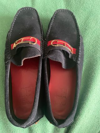 Elegantes mocasines de ante azul marino con detalles dorados y banda roja. - Diseño clásico con pespuntes. - Hebilla dorada con logo. * solo tiene 3 gomitas en las suelas gastadas