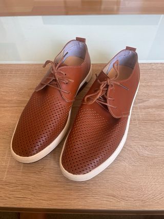 Zapatos 100% Piel Sintética, transpirables, con Cordones, ideales para el verano. Muy cómodos. Solo se utilizaron una vez. Uno de los ojales del cordón esta cedido. Número 43.