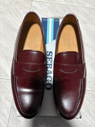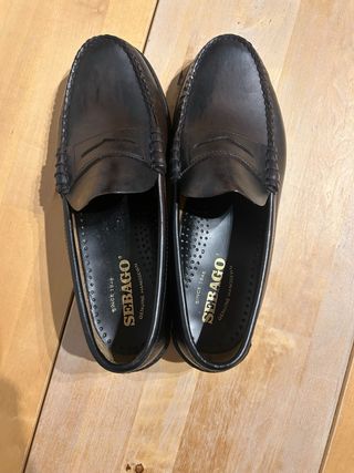 Mocasines Sebago de cuero, un clásico para cualquier ocasión. - Diseño tipo penny loafer. - Costuras visibles en la pala. - Logo de la marca en la plantilla interior. Lo único a tener en cuenta es que tienen algunas manchas de tinte de zapato. El color es marrón burdeos (tal como se ve en la foto).