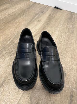Mocasines de cuero negro de Massimo Dutti. - Diseño clásico con suela gruesa. - Detalle de antifaz en la pala. - Acabado brillante. Solo usados una noche en una boda.