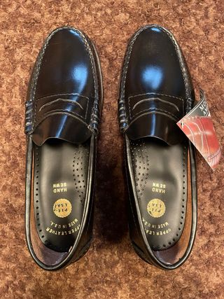 Mocasín americano fabricado en piel Durashu para hombre de color negro, montado y cosido a mano. Fabricados en EE. UU. con un diseño atemporal. Nuevos a estrenar. - Fabricados con cuero de alta calidad. - Construcción cosida a mano. - Diseño tipo penny loafer. - Talla 42 (8,5 americano)