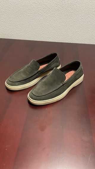 Vendo mocasines (loafers) de la prestigiosa firma D.H. Pollak, fundada en 1860. Fabricados en ante de alta calidad color gris topo con construcción artesanal cosida. Un calzado versátil, elegante y muy cómodo para el día a día. Estado: Muy buen estado, con desgaste mínimo y natural en la suela de cuero. Dimensiones y Peso: • Talla: 9.5 (UK) / Aprox. 43.5 - 44 (EU). • Medidas suela: 30,5 x 11 cm. • Peso: 890 g (el par). Incluye hormas de madera de cedro y bolsa protectora original.