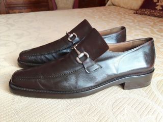 Zapatos tipo mocasín en color marrón, hechos en piel por la conocida zapatería de Santander Lucio Herrezuelo, con resultado de primera calidad y con adorno horsebit y amplias lengüetas. La piel es muy suave. Talla 44 correcta, su interior mide 30,5 cm y 32,5 cm el exterior. Se han usado poco y están en muy buen estado, como se puede ver en las fotos. Se hacen envíos.