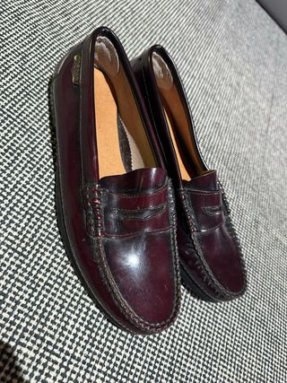 Zapatos tipo mocasín con adorno de horsebit y antifaz beige y granate que se puede ajustar con el velcro. Son de piel, mocasín y suela. Talla 43 grande, podría valer para un 44 (medida interior en última foto). Apenas usados, están en muy buen estado. Hago envíos.
