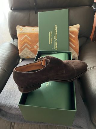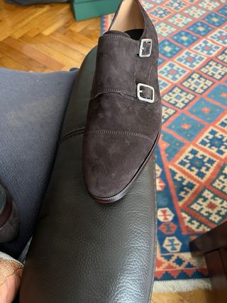 Elegantes zapatos artesanales de piel vuelta. - - MANDE PONER UN ALZA DE 1,5 al zapatero en el TACÓN DERECHO. Cualquier zapatero los deja en su estado inicial). -Nunca sacados de su caja tras poner el alza. - Modelo The Palermo. - Construcción Goodyear Welted. - Hebillas dobles.Modelo Palermo Goodyear welted PRECIO NO NEGOCIABLE. NUNCA ESTRENADOS.