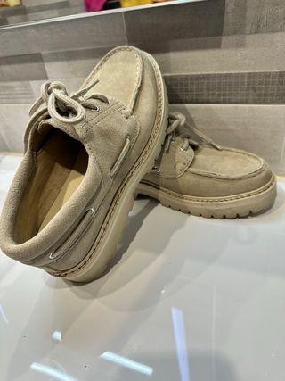 Zapatos náuticos de ante en color beige. Un calzado cómodo y con estilo. - Cierre con cordones. - Suela gruesa y resistente. - Diseño moderno. Comprados en exclusiva para una boda. Usados durante una mañana y de vuelta al armario. Están nuevos