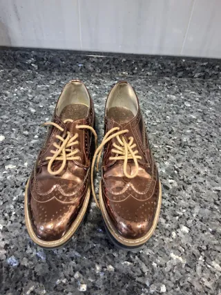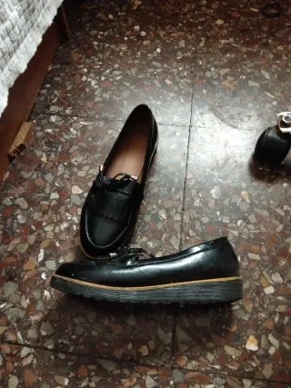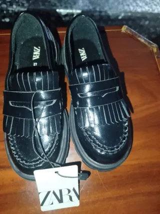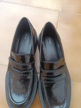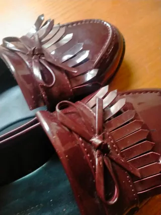 Mocasines de charol con detalle de flecos y suela gruesa. - Diseño moderno y elegante. - Acabado brillante. - Cierre sin cordones. Sin estrenar perdí el ticket y le estan pequeños
