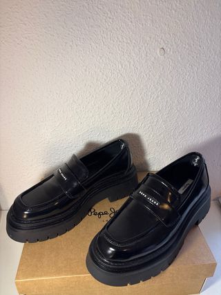 Mocasines de la marca Pepe Jeans en color negro. Están como nuevos. Cualquier pregunta, no dudes en escribirme - Diseño clásico con suela gruesa. - Detalle de antifaz en la pala. - Acabado brillante.