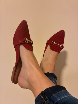 Mocasines destalonados de ante con detalle metálico. - Diseño de punta afilada. - Adorno de hebilla dorada. - Tacón bajo. Son talla 35 para validos para 37