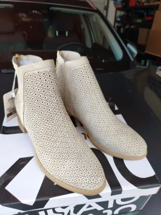 Botines de mujer con un diseño calado y elegante. - Color beige. - Detalle de cremallera dorada en el lateral. - Suela de goma. - Sin estrenar, con etiqueta. Hago precio si coges varios productos de mi perfil.