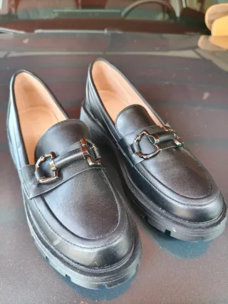 Elegantes zapatos negros para mujer tipo mocasines. - Acabado brillante. - Suela gruesa y resistente. - Detalle de hebilla metálica en la pala. - Estado: nuevo sin etiqueta