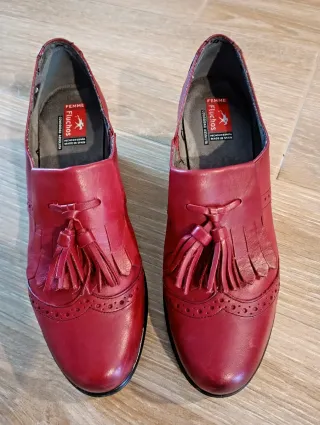 Elegantes zapatos de piel color burdeos para mujer de la marca Fluchos. Muy cómodos con suela de cuña. - Diseño con flecos y detalle de pequeñas borlas. - Fabricados en España. Sólo puesto dos veces