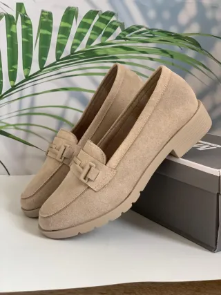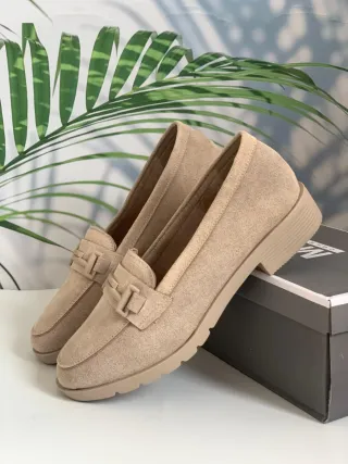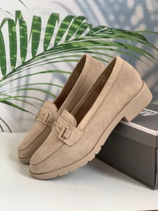 Mocasines de estilo clásico en color beige. - Diseño elegante con antifaz. - Suela gruesa y cómoda. - Detalle de pespuntes en contraste.