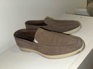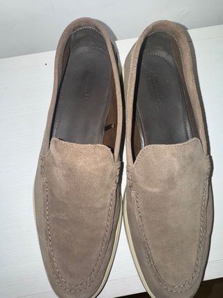 Mocasines de ante en tonos beige y marrón. - Diseño clásico y elegante. - Suela de goma. - Detalle de pespuntes. Necesita limpiar un poco pero estas casi sin uso