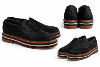 Zapatos negros sin cordones / slip-on, tipo mocasin, de piel natural con pelo negro auténtico y elástico lateral. Suela gruesa compuesta por capas de cuero, madera y goma, y costura visible. Hechos en España. En muy buen estado, puestos muy pocas veces (me aprietan porque tengo el dedo gordo muy grande!) #teddyboyshoes #hairhideshoes #womenssliponshoes #realhairhide #nederlands #beligique #france #portugal #hairyshoes #zapatospeludos #artensanal #madeinspain #pielautentica #realleather #2026shoetrend