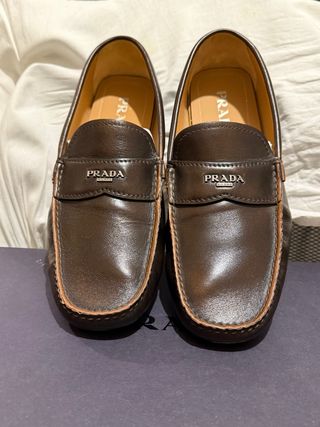 Mocasines Prada auténticos de piel color marrón oscuro. Usados solo 1 vez, en estado prácticamente nuevo. Modelo: 2DD165 Made in Italy. Talla: 8½ (EU aprox. 41–41.5). Incluye caja original Prada y etiquetas. Sin defectos ni desgaste visible. Envío desde Madrid, España. Acepto ofertas razonables.