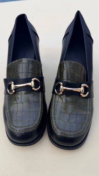 Elegantes zapatillas de tacón con diseño de mocasín y detalle de hebilla dorada. - Acabado texturizado tipo piel de cocodrilo en la parte delantera. - Tacón grueso y cuadrado para mayor comodidad y estilo. - Combinación de colores negro y verde oliva.