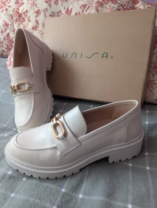 Zapatos mujer estilo mocasines de la firma española UNISA: Made in Spain ✓✓✓✓✓ TODO PIEL 100% Forro, plantilla también en piel. Talla 37. Color crema / blanco con adornos dorados que ponen la marca UNISA. Suela de goma antideslizante, y confort. Altura: 4 cm tacón ancho con 2 cm delantero. Como Nuevo: plantas como nuevas. Un sólo uso: vendo por no quedarme bien de talla.