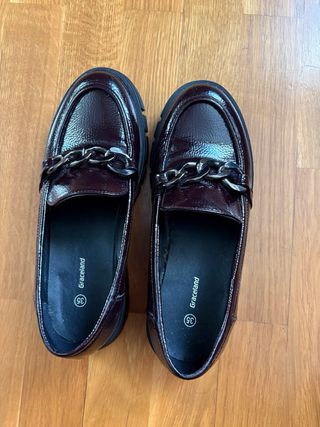 Mocasines de charol burdeos con detalle de cadena. Suela gruesa. Sin apenas uso ver fotos por un problema en el pie