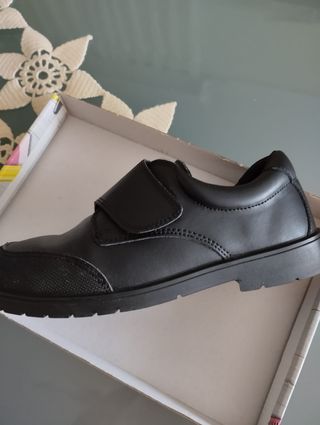 Zapatos de niño, de piel, color negro y talla 32. Están prácticamente nuevos, solo se usaron una vez. - Fabricados en piel. - Cierre de velcro. - Suela resistente.