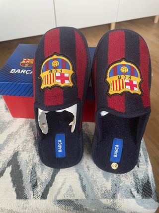 Zapatillas de estar por casa del FC Barcelona para niñ@. Con el escudo del equipo en la parte delantera. NUEVAS, SIN ESTRENAR - Numero 33 - Diseño a rayas rojas y azul marino. - Marca: MARPENSLIPPER -Motivo de venta: no le vale el número y se ha pasado el plazo de devolución - Precio en tienda:29,90