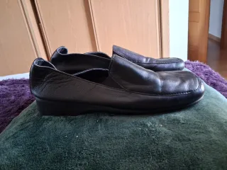 Zapatos tipo mocasín en color negro, diseñados específicamente para ofrecer el máximo confort durante todo el día. Estilo/corte: Diseño de punta redondeada con elásticos laterales en el empeine para facilitar el calce y adaptarse al pie sin apretar. Suela plana y flexible con puntera reforzada. Estilo minimalista y funcional. Talla: 38 Medidas aprox.: Largo de la plantilla: 24,5 cm Suela: Plana/mínima elevación Estado: Buen estado. Presentan las marcas naturales de uso en el empeine (arrugas propias del material al caminar), pero están perfectamente cuidados, limpios y sin defectos estructurales ni rotos. Hashtags: