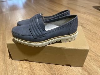 Mocasines de la marca Clarks, modelo Driftlite, en talla 41. Son cómodos y ligeros. - Exterior de tela azul. - Detalle en piel marrón en el talón y la lengüeta. - Suela blanca. - Cierre sin cordones.