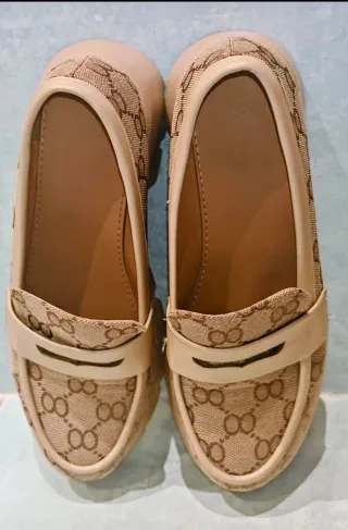 Vendo estos mocasines de plataforma en color beige/camel, ideales para un look moderno y cómodo. Tienen un diseño muy actual con suela tipo "track" que aporta altura sin cansar los pies. Detalles del producto: Color: Tonos beige y tierra con estampado de monograma. Talla: 40 Estilo: Zapato bajo tipo mocasín con plataforma gruesa y dentada. Estado: En muy buen estado, como se aprecia en las fotos de la suela y el tejido, puestos dos veces. Vendo estos mocasines de plataforma en color beige/camel, ideales para un look moderno y cómodo. Tienen un diseño muy actual con suela tipo "track" que aporta altura sin cansar los pies. Det