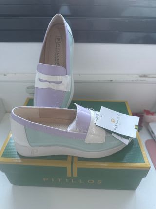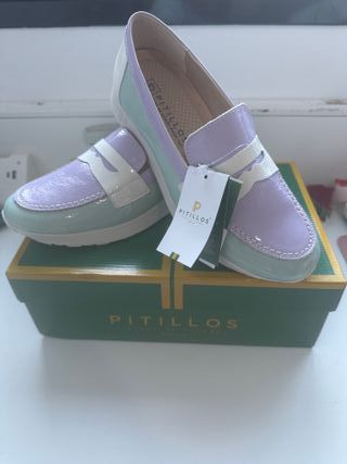 Mocasines de la marca Pitillos en tonos morado y verde menta. Un diseño moderno y cómodo. Es un 38 pero el tallaje es pequeño es como 37 - Detalle de antifaz en blanco. - Acabado brillante. - Suela de goma.