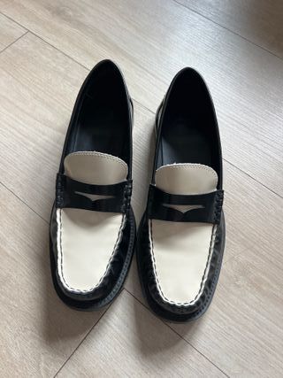 Mocasines de piel con un diseño bicolor. Talla 38, como nuevo - Combinación de negro y beige. - Detalle de antifaz en la pala. - Suela de goma.