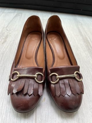 Elegantes mocasines de cuero en color marrón. - Detalle de flecos y hebilla dorada. - Diseño clásico y sofisticado. - usados una vez o dos