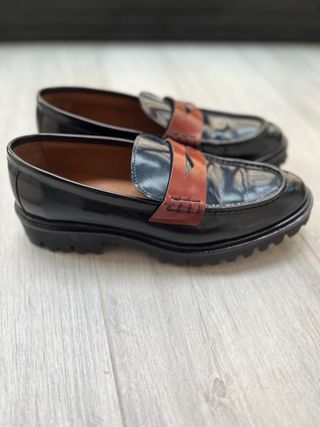Mocasines clásicos en muy buen estado. Entrego en Bilbao - Diseño tipo penny loafer. - Acabado de cuero brillante. - Costuras visibles en contraste.
