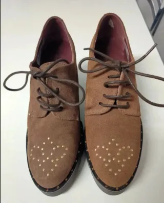 Mocasines de cordones con un diseño moderno y detalles únicos. - Material exterior de ante. - Adorno de tachuelas doradas en la puntera. - Cierre de cordones. - Interior forrado. Nuevos, aún con etiqueta.