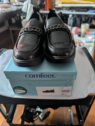 Mocasines negros de la marca Comfeet, talla 37. Un calzado elegante y cómodo. - Diseño con cadena metálica. - Acabado brillante.
