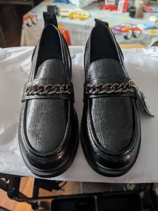 Mocasines de señora con un diseño moderno y elegante. Pone numero 39 pero rallan pequeños. Son para un pie n. 38 - Detalle de cadena metálica en la pala. - Suela gruesa y robusta. - Acabado liso.