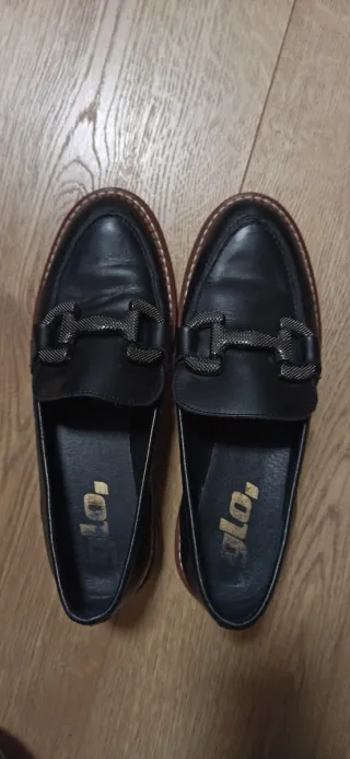 Mocasines de cuero negro con un detalle metálico en la hebilla. Tiene un pequeño tacón cómodo. Tienen 2 usos sólo. La suela está intacta. Me costaron 80€. - Material exterior: Cuero. - Diseño tipo mocasín. - Adorno metálico en la parte delantera.