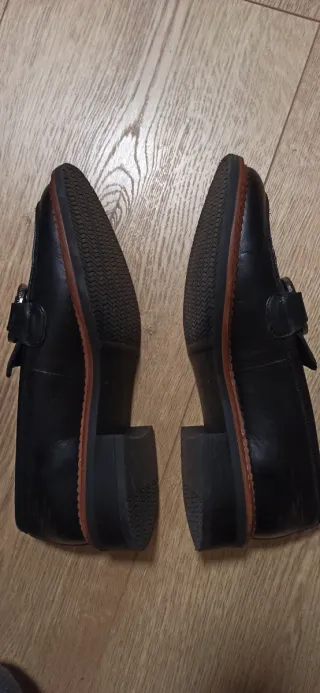 Descripción Zapatos negros de piel tanto el exterior como el interior. Fabricación española de calidad Tira con hebilla en el empeine Suela de goma Muy poco uso.